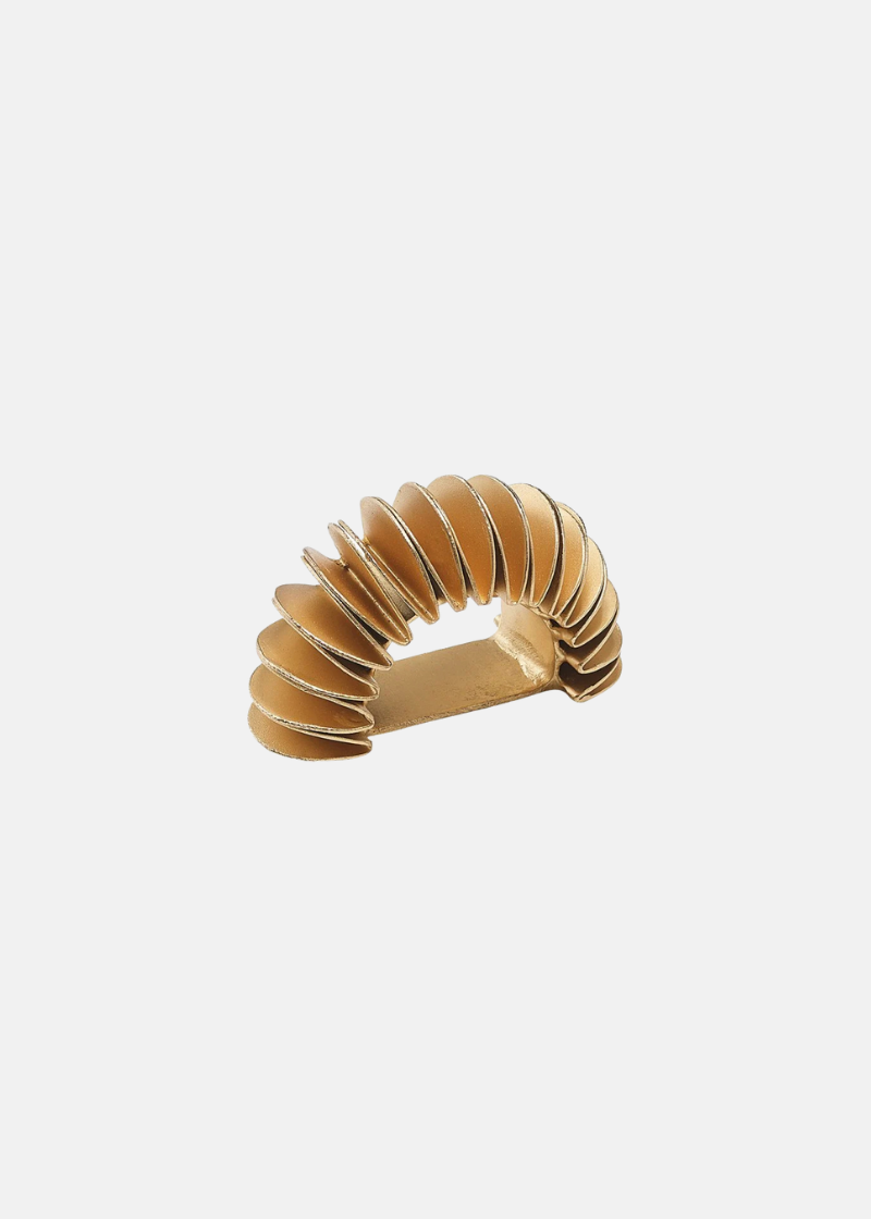 The Demilune Napkin Ring, inspired by the phases of the moon, features a crescent shape crafted by hand-folding metal discs. Each disc is individually positioned on a metal base, creating a carefully composed design. This elegant napkin ring introduces a sculptural element and a subtle shine to elevate any dining arrangement.
