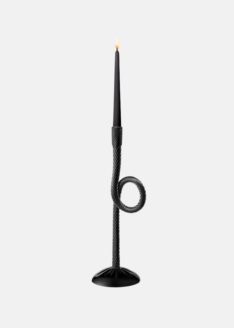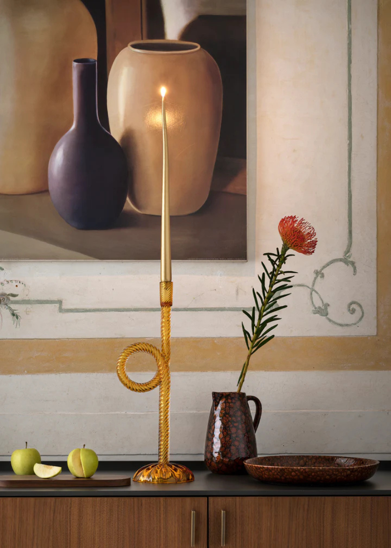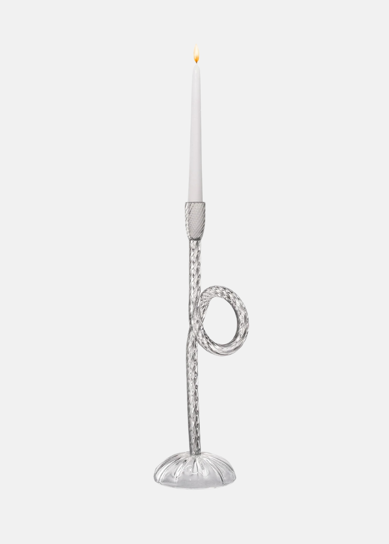 Aina Kari honors the city of Venetian Lagoon, incorporating the iconic knots and ropes found in everyday life. This unique and modern candleholder showcases mastery in shaping blown glass at a 360 degree angle.