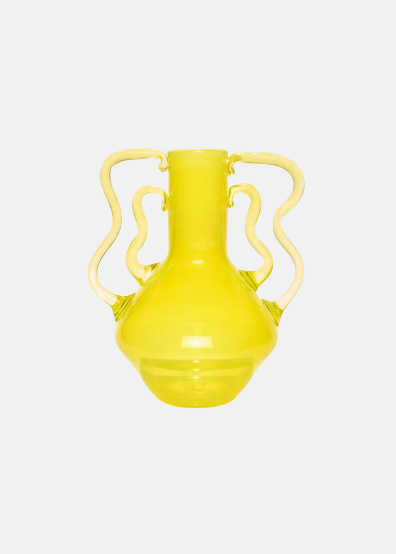 This Sicily Vase is a fun interpretation of the Trinacria, a symbol that represents the Italian island. The curvy layers of handles on the slim neck imitate the Medusa-inspired emblem. The round and plump shape is achieved by blowing vivid hues of glass, and then attaching each unique hand-crafted handle. The vase features a lively yellow color, reminiscent of the scorching heat of the Mediterranean in Italy.