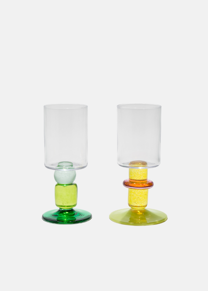 Their Miami Wine Glass collection features stems of stacked shapes in candy-like colours. Each glass is handmade and due to the individual nature of their stems, the glasses can vary in height.