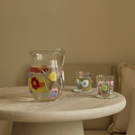 The fantasia jug features Murrine: colored patterns or images inside a glass cane, obtained by fusing several colored glass canes that are pulled for over 100m and then cut into thin cross-sections that reveal the final pattern. Laguna~B uses high-quality murrine, big in shape: these are the rarest since they constitute the very ends of the glass cane.