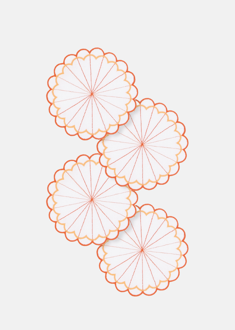This set of linen coasters is designed with a two-tone embroidered scalloped border.