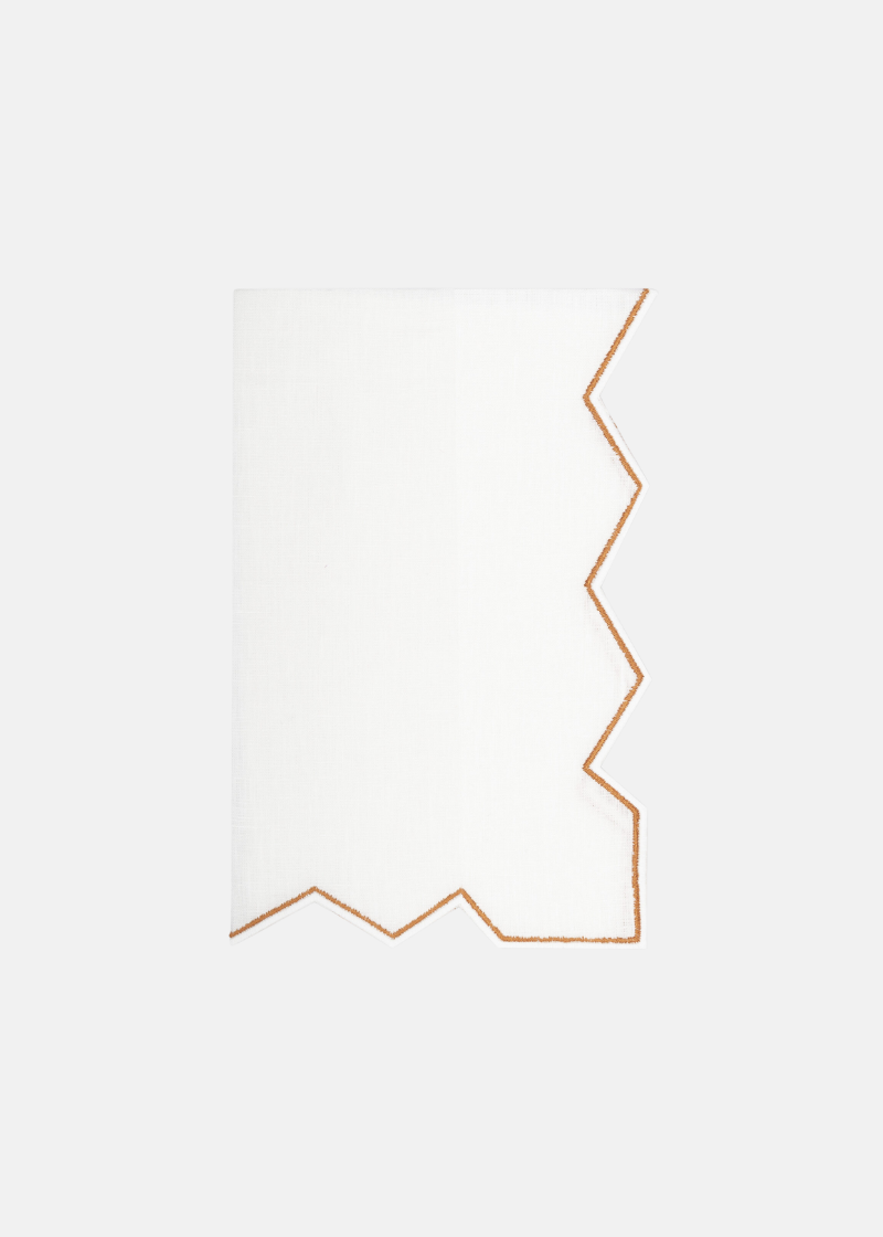 Established in 1880, Los Encajeros is a luxury linen family brand based in Bilbao, Spain. Each piece is handmade by craftspeople using only the highest quality material. The Gernika Sol Napkin is made of linen with double scalloped edges in a pointed design.