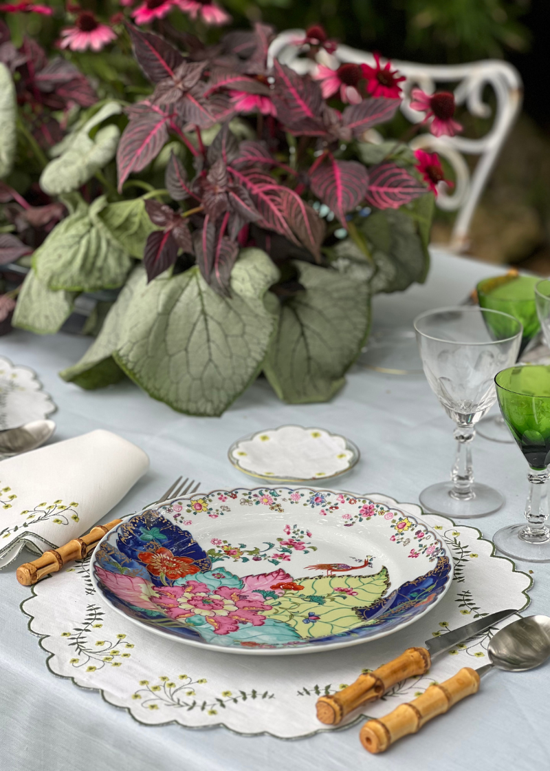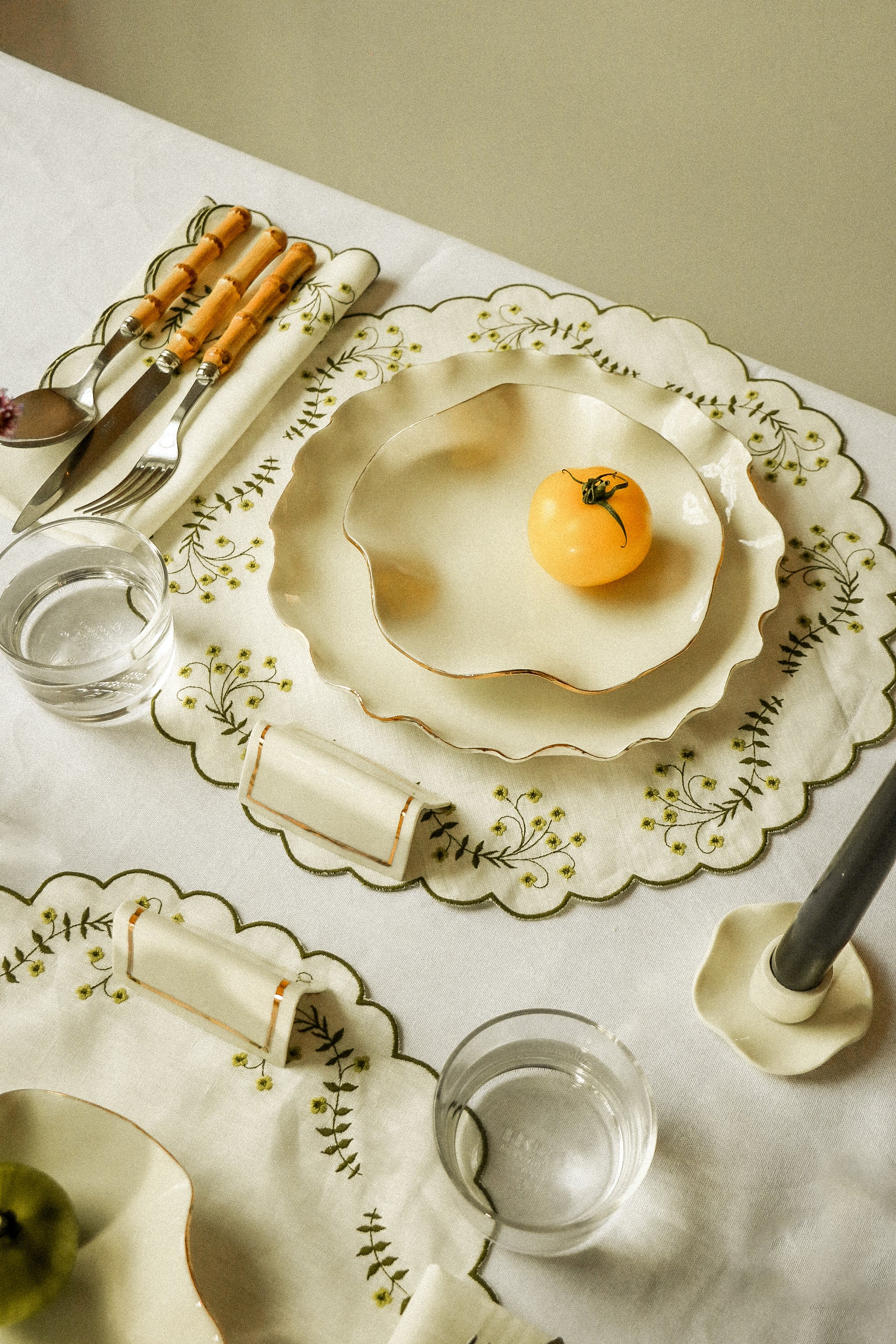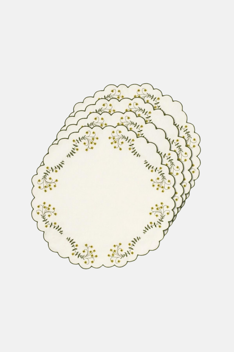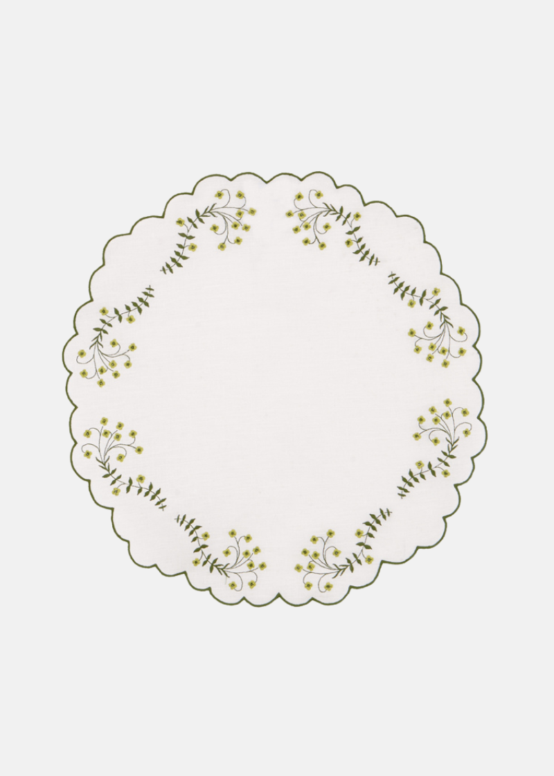 Established in 1880, Los Encajeros is a luxury linen family brand based in Bilbao, Spain. Each piece is handmade by craftspeople using only the highest quality material. The Spring placemat in green is woven from natural linen offset by floral embroideries and a contrast trim.