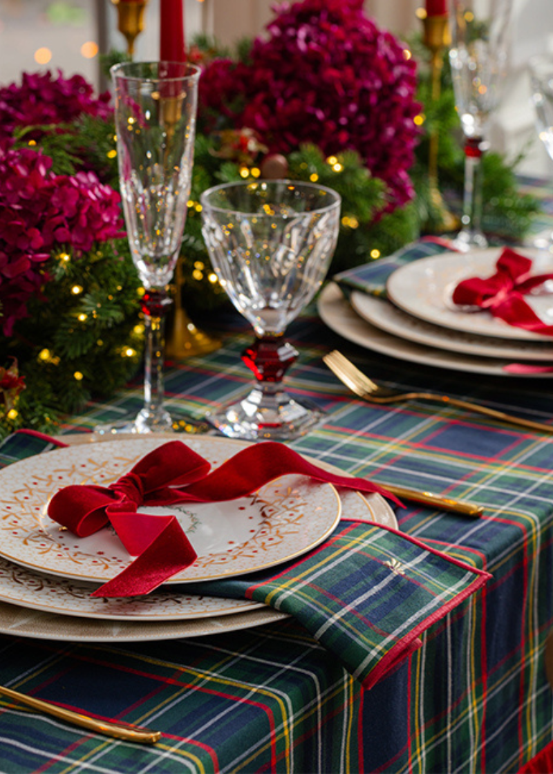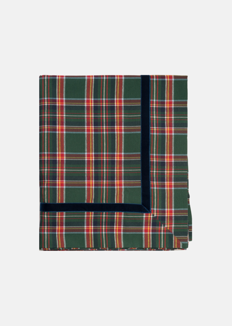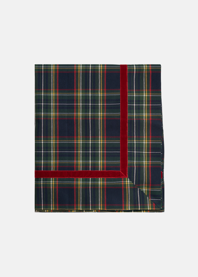 A quintessentially Christmas tablecloth featuring a signature tartan pattern. The tablecloth is available with either a Dark Blue piping detail or Red piping.