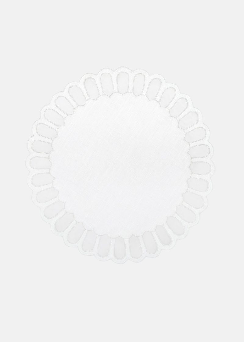 Established in 1880, Los Encajeros is a luxury linen family brand based in Bilbao, Spain. Each piece is handmade by craftspeople using only the highest quality material. The Bilbao is a square one-toned Embroidered placemat bordered with two white embroidered scalloped trims.