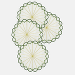 This set of linen coasters is designed with a two-tone embroidered scalloped border.