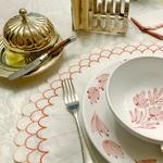 Established in 1880, Los Encajeros is a luxury linen family brand based in Bilbao, Spain. Each piece is handmade by craftspeople using only the highest quality material. The Escamas placemat has an oval design bordered with a two-tone embroidered scalloped trim.