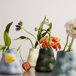 This porcelain vase is perfect for single stems or small wild flower posies. It comes in several colors and its surface dances under dabbled light, creating a sculptural effect whether it's being used as a vase or displayed on a shelf. The interior is glazed while the exterior has a raw porcelain satin finish.