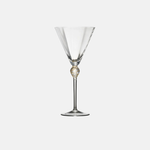 The elegant Daphne Wine Glass is expertly mouth-blown in the Czech Republic from clear glass. It showcases a delicate hand-applied knot detail flecked with gold, adding a striking contrast and sophisticated visual appeal. Pair it with the matching flute and tumbler or combine it with other pieces from our colored glassware collection for a distinctive table setting.