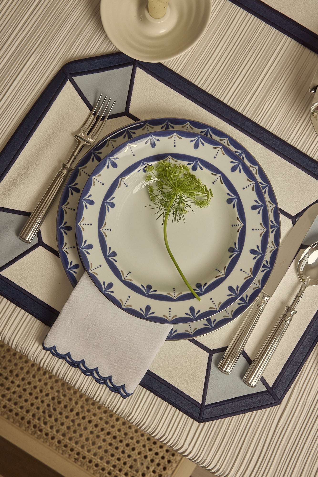 Crafted by our in-house experts to provide a bold combination of color and texture. Here, we’ve styled our pleated tablecloths with leather placemats, pairing them with Alhambra dinnerware in Blue. Ripple porcelain candleholders, our Line cutlery collection, and silver bowls add the finishing touches