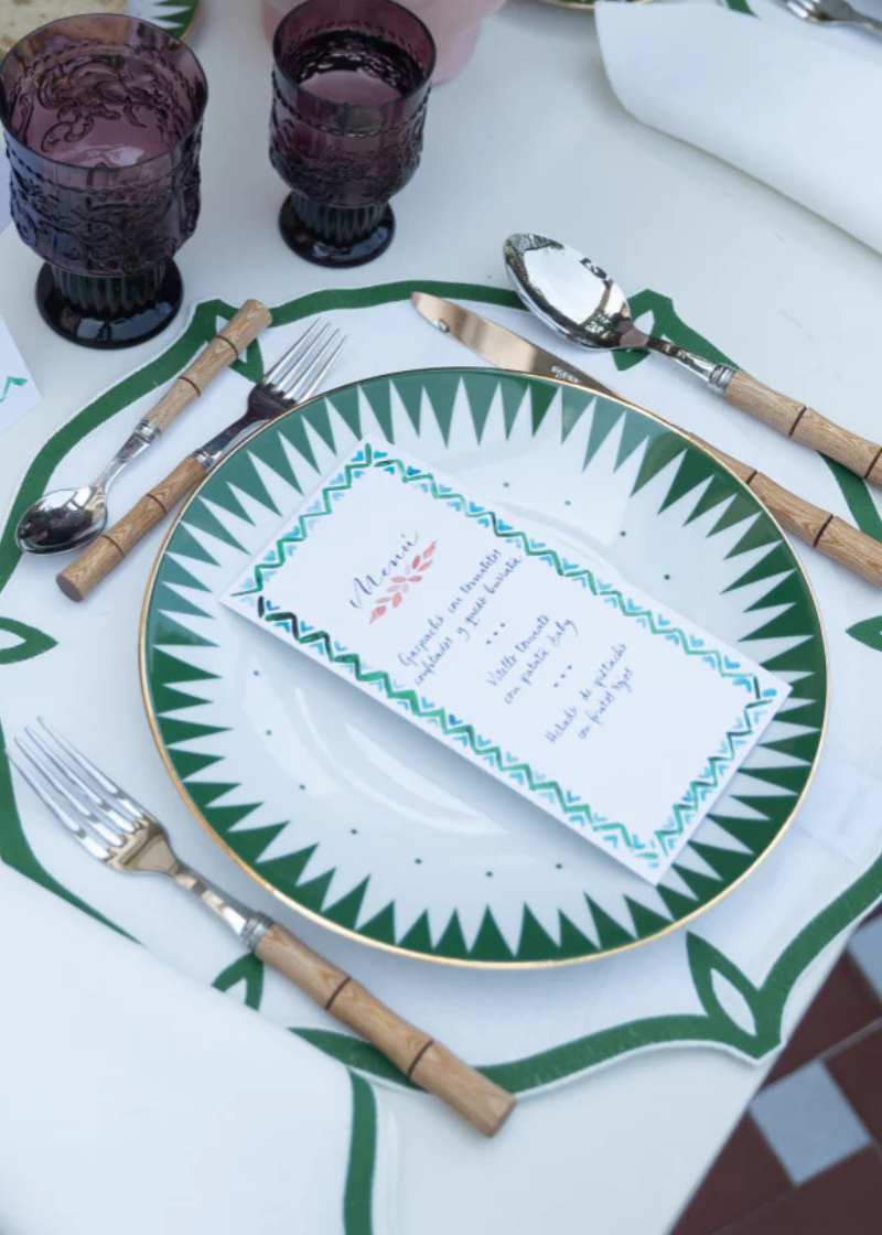 Crafted by our in-house experts to provide a chic table setting perfect for a summer get together. Here, we’ve styled our Olimpia placemats and napkins with the Green punk dinnerware set alongside a set of bamboo cutlery.