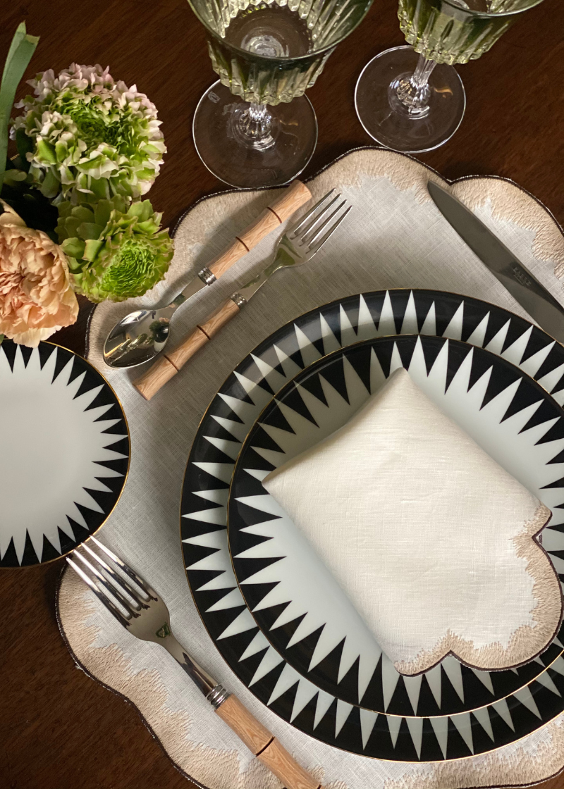 Crafted by our in-house experts to provide a combination of bold geometric shapes alongside softer tones. Here, we’ve styled our Valver placemats and napkins with the Black punk dinnerware set alongside a set of bamboo cutlery.