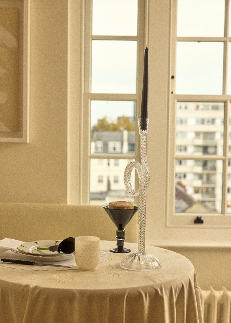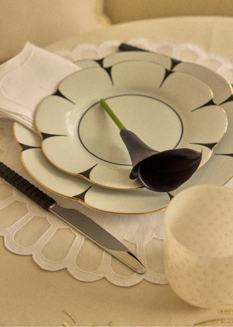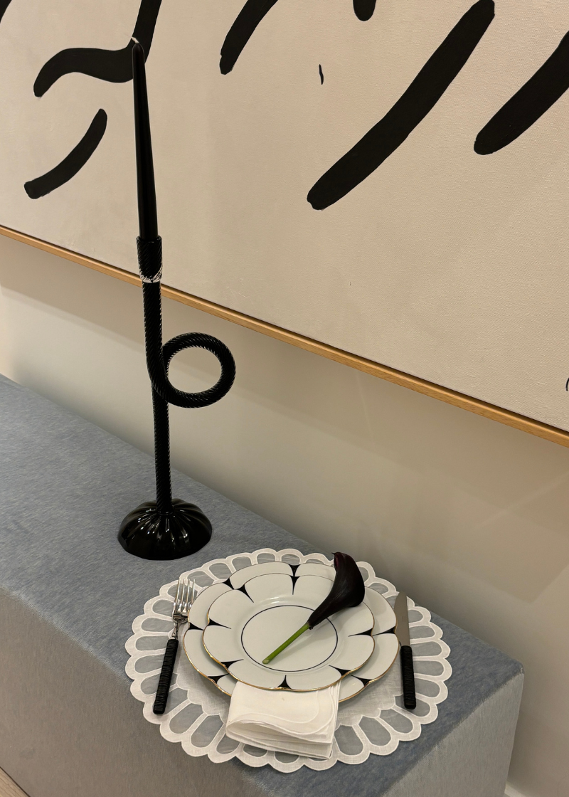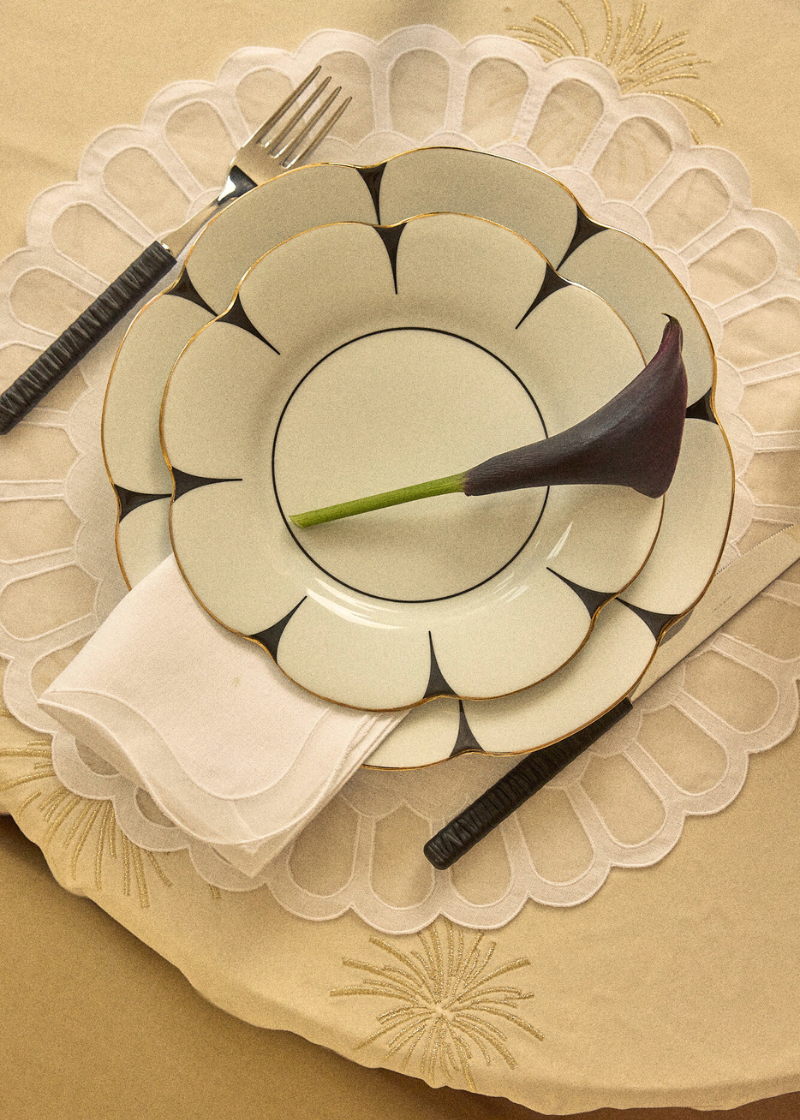 Crafted by our in-house experts to provide a bold combination of color and texture. Here, we’ve styled our La Fete tablecloth with a simple dainty linen placemat and our drops collection tableware. Murano glass Bolle tumbles from Laguna B and candleholders from Aina Kari paired with a martini glass from Gather and our rattan cutlery collection add the finishing touches.