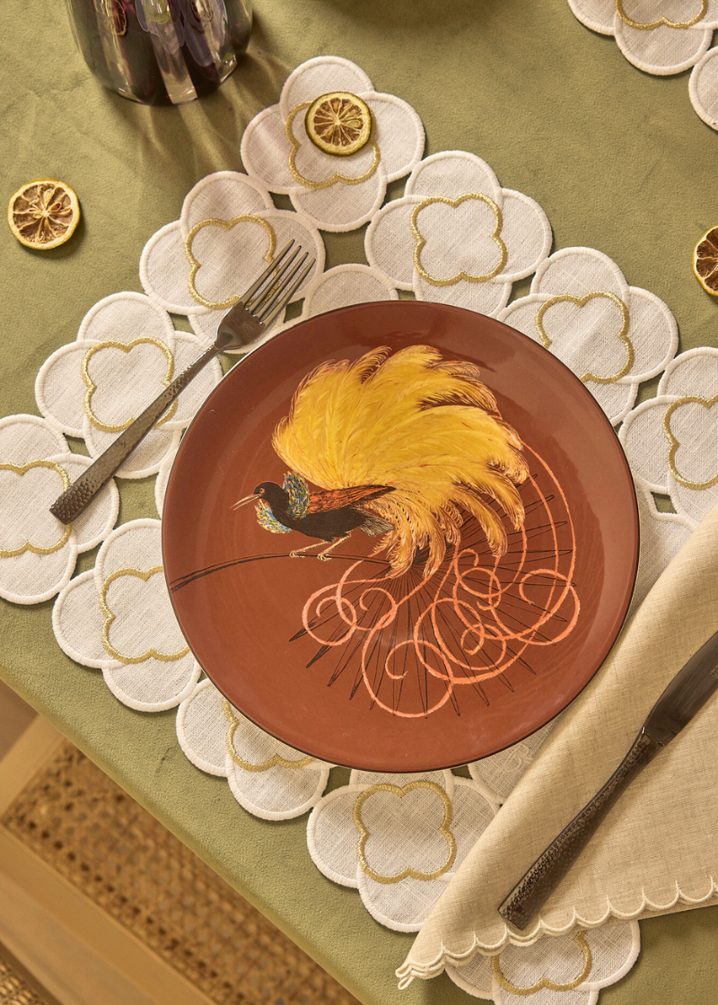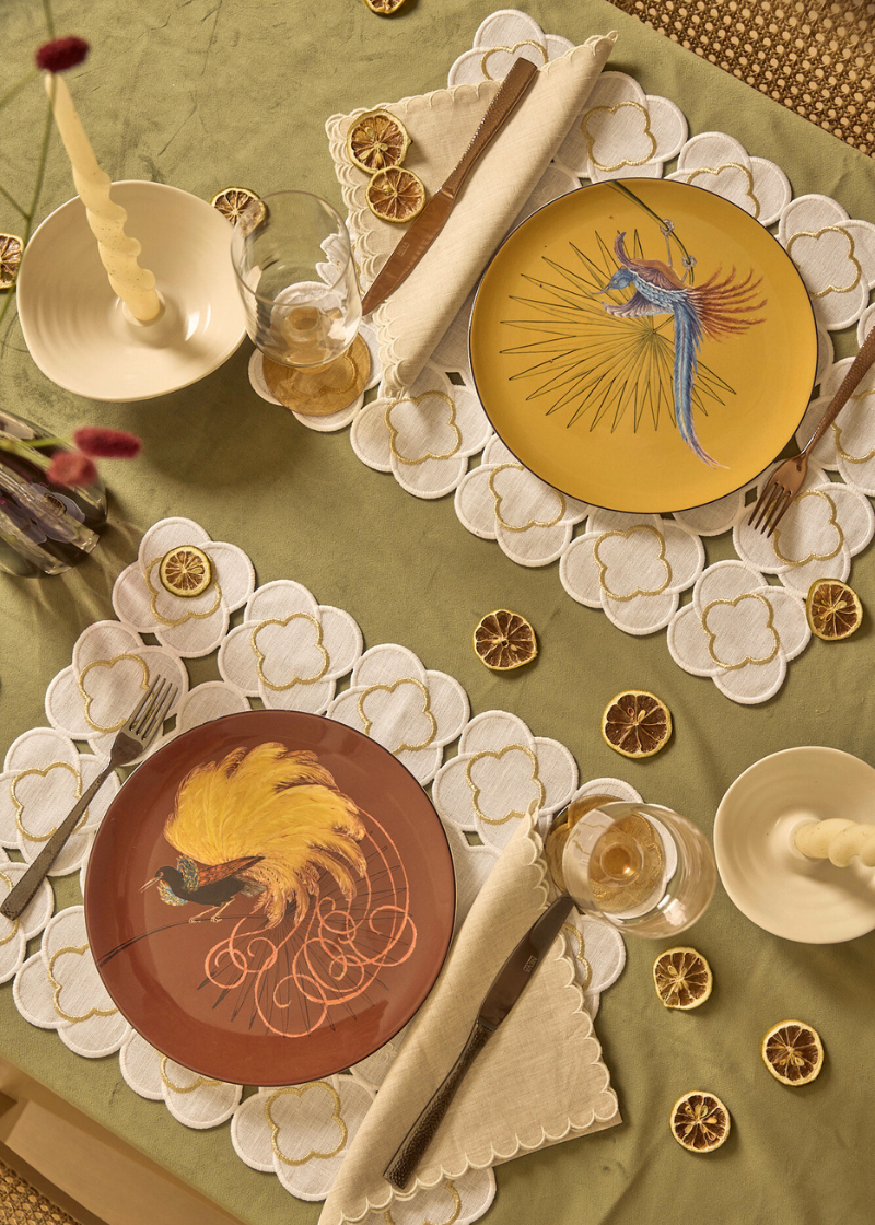 Crafted by our in-house experts to provide a bold combination of color, playfulness, and texture. Here, we’ve styled our signature velvet tablecloths with the flower market placemats, pairing them with the Paradise dinnerware from Laboratorio Paravicini. For the dinner plates, you can opt for either a full set of one color or a mix and match of the different colors available.