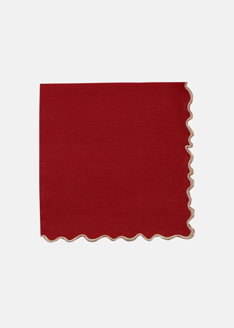 Established in 1880, Los Encajeros is a luxury linen family brand based in Bilbao, Spain. Each piece is handmade by craftspeople using only the highest quality material. The Boreal is an embroidered linen napkin with irregular abstract shapes. It has been designed to add a touch of sophistication and art to your table. Crafted from premium linen, each piece is delicately adorned with a champagne gold scalloped edge, traced in irregular abstract shapes that provide a unique and contemporary style.