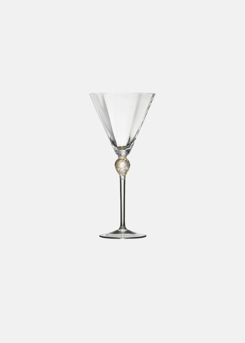 The elegant Daphne Wine Glass is expertly mouth-blown in the Czech Republic from clear glass. It showcases a delicate hand-applied knot detail flecked with gold, adding a striking contrast and sophisticated visual appeal. Pair it with the matching flute and tumbler or combine it with other pieces from our colored glassware collection for a distinctive table setting.