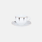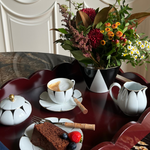 This set use a white base of pure and fine porcelain. They are then crafted in the shape of delicate flower petals with black lines that accentuate each curve. The gold edged borders add a touch of additional luxury for a sophisticated table setting.