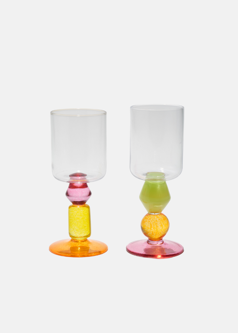 Their Miami Wine Glass collection features stems of stacked shapes in candy-like colours. Each glass is handmade and due to the individual nature of their stems, the glasses can vary in height.