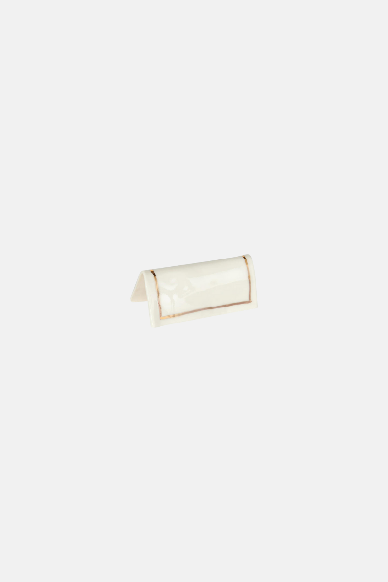 Porcelain Place Card with Gold Lustre Border. Each one is individually handmade. Can be written on and wiped clean. They are designed and made in Joanna's London studio. She likes to work intuitively with the clay so each piece will be unique.
