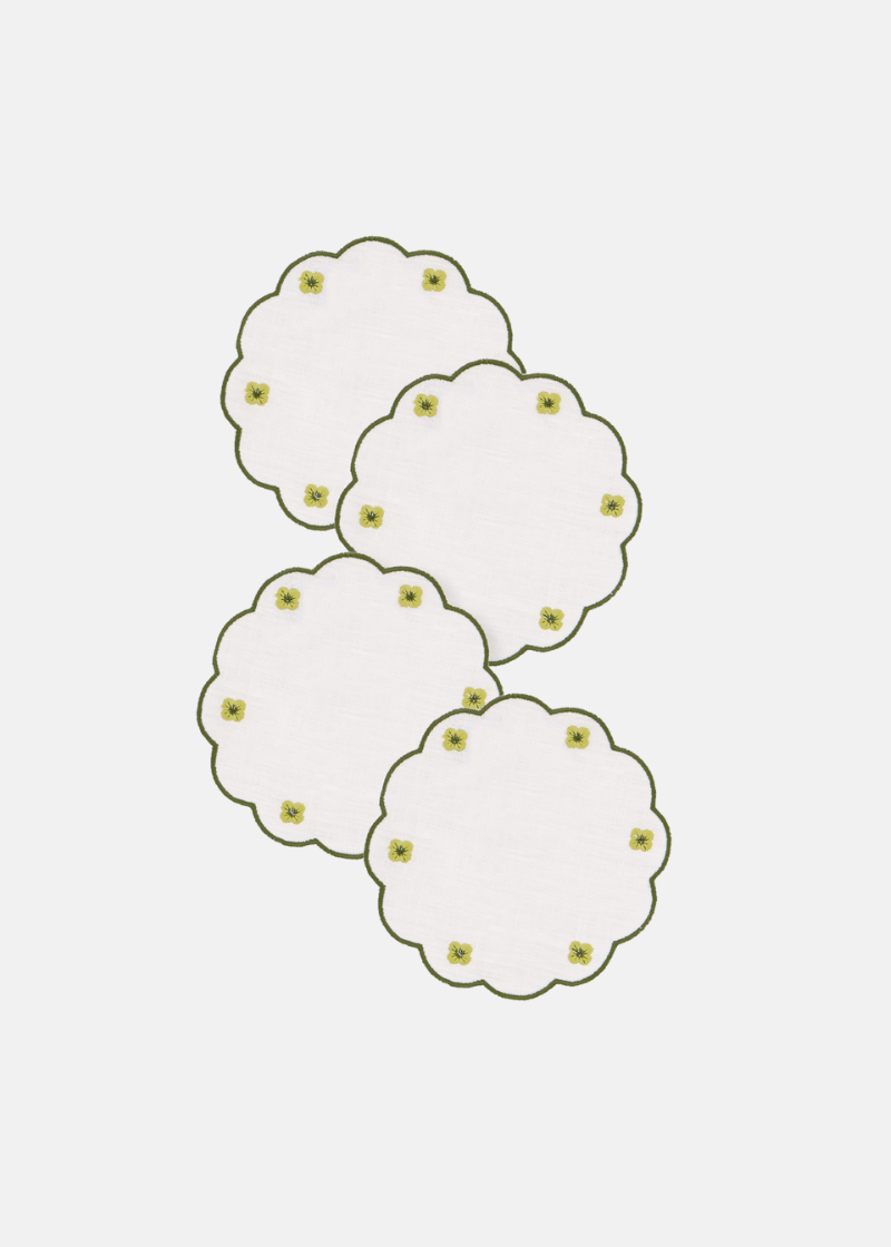 Each coaster is woven from natural linen offset by floral embroideries and a contrast trim.