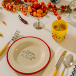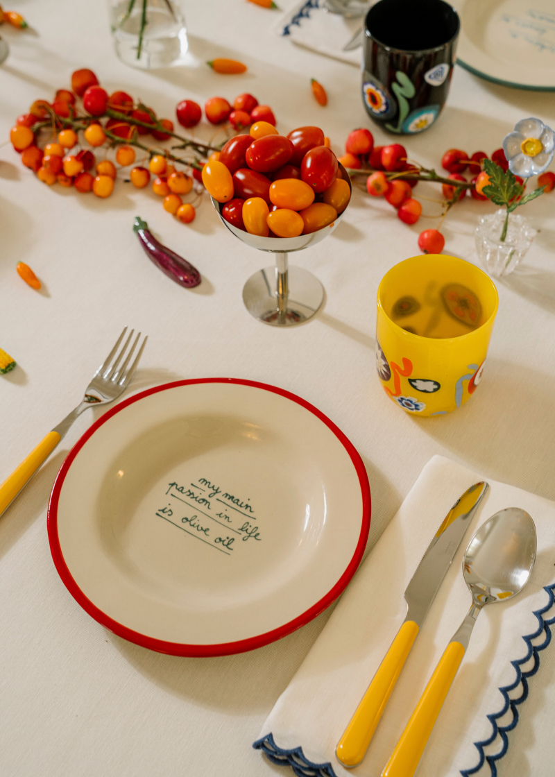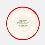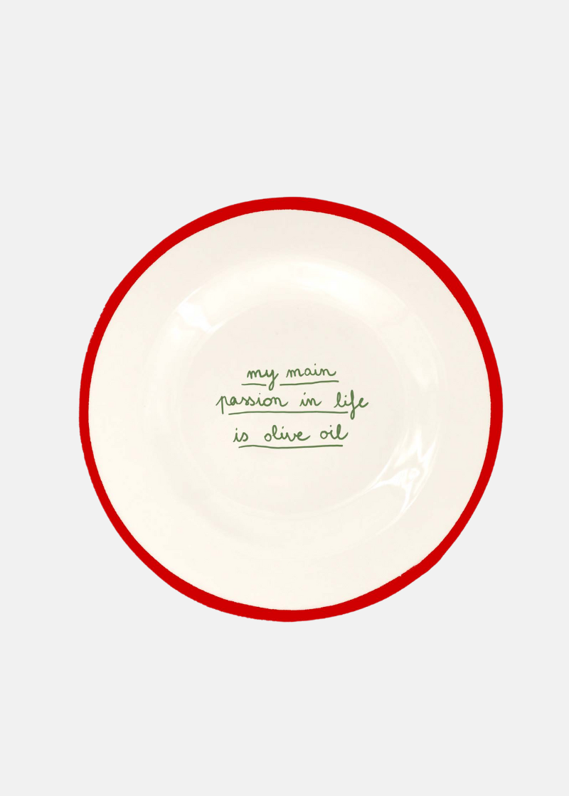From the exclusive SOFRA x Laetitia Rouget collaboration, this handcrafted plate features 'My main passion in life is olive oil'. The plate celebrates the Mediterranean’s most essential ingredient with wit and charm. Ideal for bread and olive oil, mezze spreads, or as a bold tabletop statement.